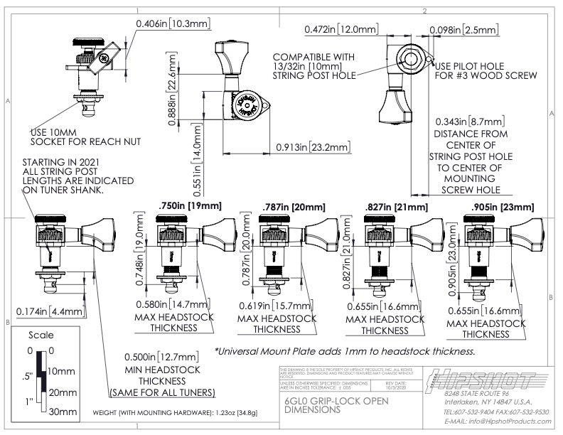 - 6 Hipshot GRIP LOCK tuners for 10mm Post Holes