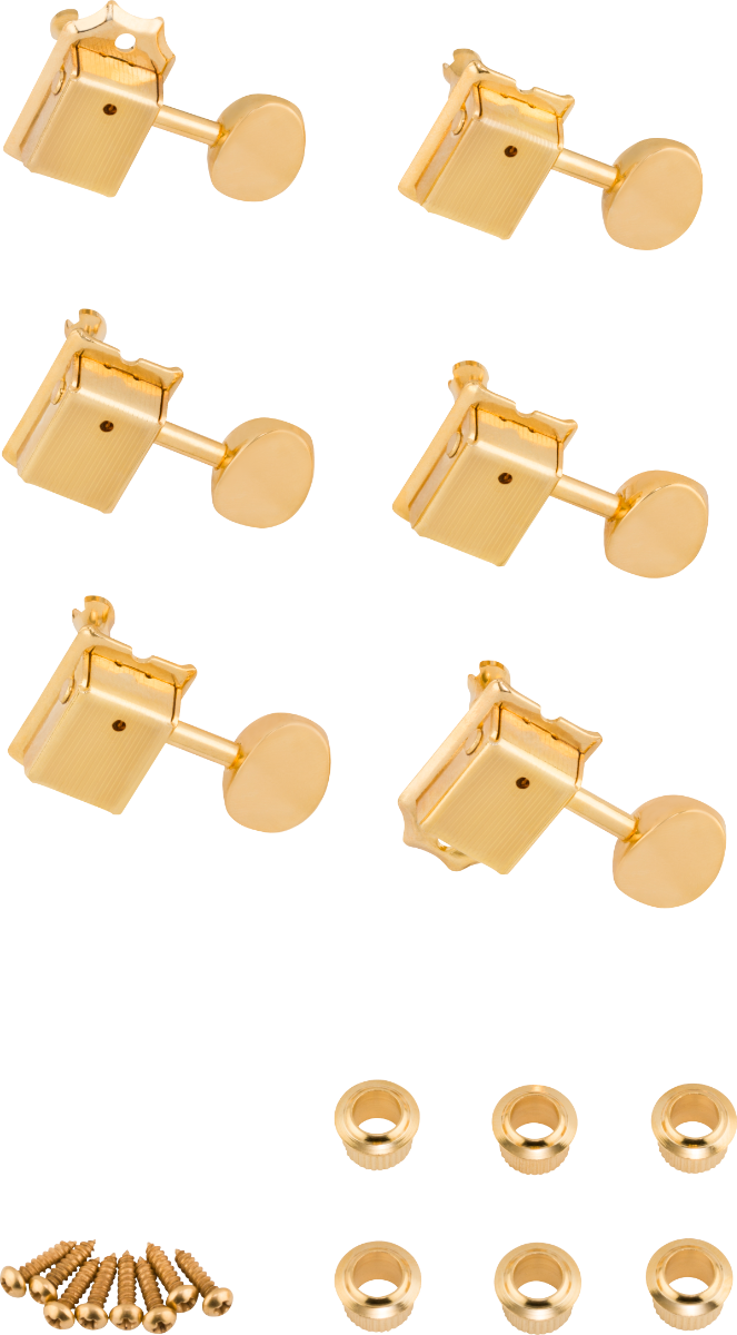 Set of six vintage-style chrome tuning machines for use on Classic, Classic Player, Deluxe, Pawn Shop™ and Road Worn® Stratocaster® and Telecaster® models; also fits Cyclone™ and Toronado® guitars. Mounting hardware sold separately. (Mounting Screws: Gold, p/n 0018823049, Nickel: p/n 0011357049) (Bushings: Gold, p/n 0027703049, Nickel, p/n 0994946000).