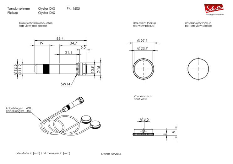 The Schaller Oyster is available in three different versions: as single (S/S or S/P) or double (D/S), whereby the two Oyster piezos of the D/S allow a wider frequency spectrum. It can be easily mounted with the included jack sockets or plugs of 6.35 mm (1/4″) diameter.