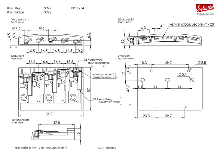 Schaller Germany 3D5 5-String Flatmount Roller Bass Bridge, BLACK 12140400