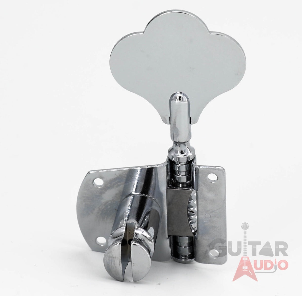 (4) Genuine Fender chrome vintage style tuners for Mexican Standard and Highway 1 Series Basses. Requires 11/16"(18mm) peghead holes. Mounting hole spacing is 1" across the top, 25/32" across the bottom, and 1-5/16" top to bottom (on center).