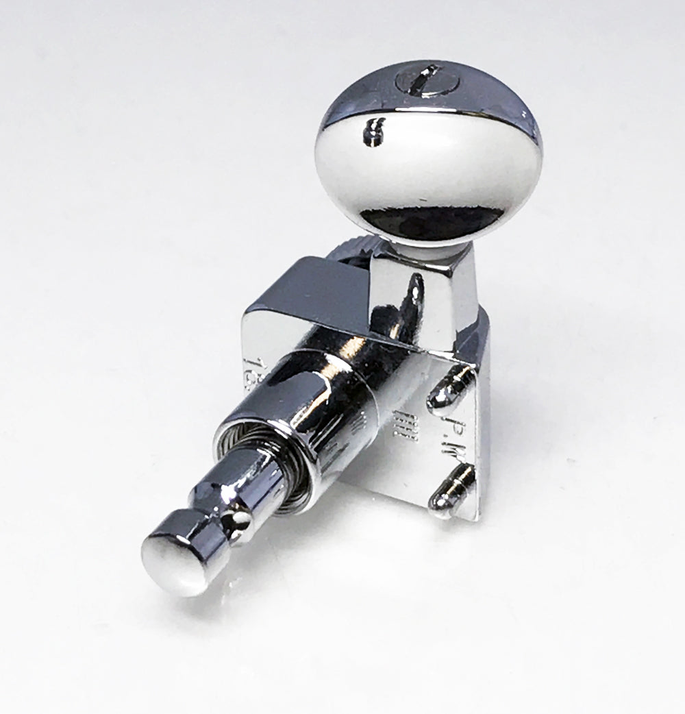 Set of 6, shiny chrome finish, Fender locking tuning machines with vintage butterbean buttons. Used on American Deluxe Series Guitars. Excellent drop-in tuner upgrade for all Strat and Tele style headstocks with 2 pin mount and 10mm tuner holes (not Vintage or Vintage Reissue with 8.5mm holes). 8:1 gear ratio and Staggered posts. Lock your strings down at the tuners for maximum tuning stability.