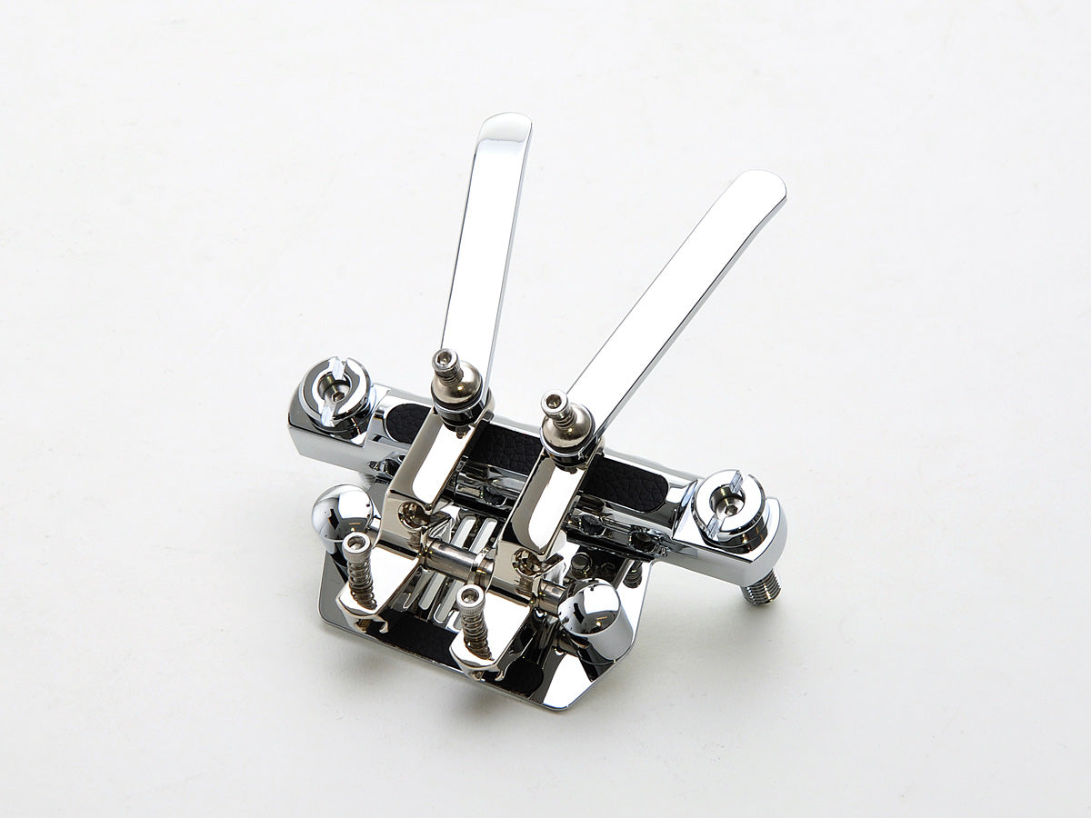 Enables amazingly real pedal steel effects by pressing one lever. The levers can be positioned anywhere on the axle so that any of the upper 5 strings (A D G B E) can be used. The strings are simply hooked into the levers and can then be tuned up one or two half-steps by pressing on the levers with the palm of your hand. The interval and the rest position can be precisely adjusted using two knurled screws.