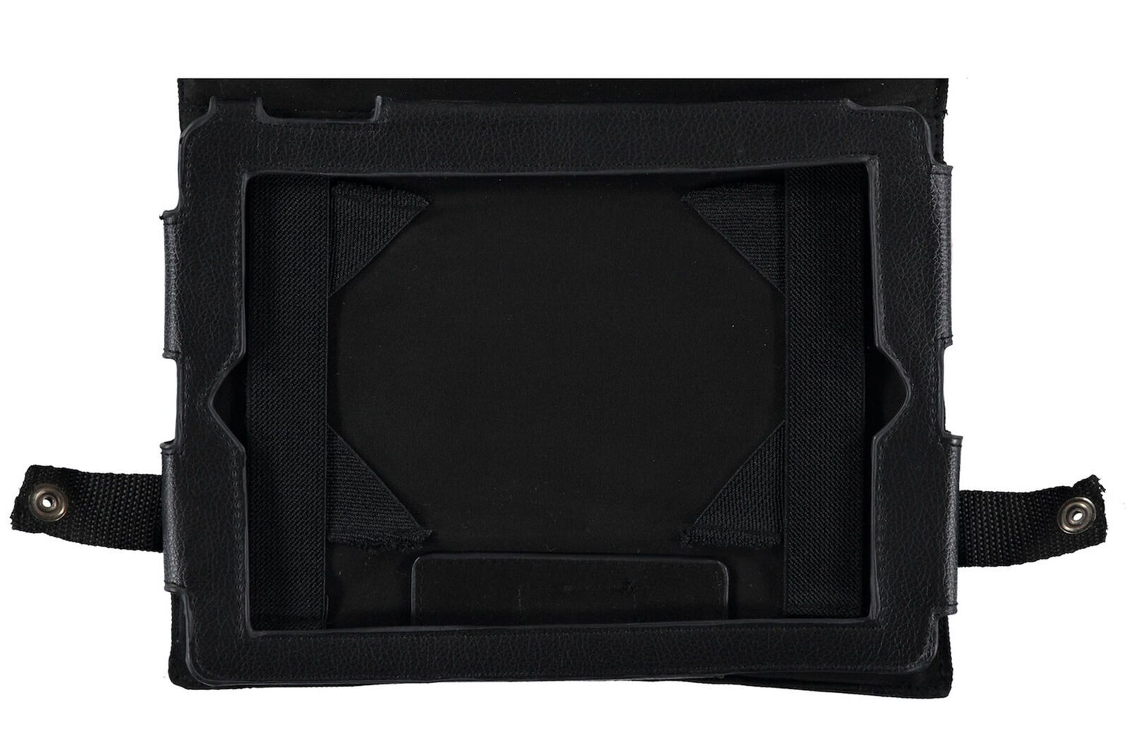 Two models are available: the Two Hand Touch 9 and the Two Hand Touch 12, which are designed to perfectly fit the standard iPad 9.7-inch size and the iPad Pro 12.9-inch size, respectively. With multiple elastic bands in different configurations included on the inside of the case, tablets and phones of all sizes can easily be secured as well. When not in use, the case flattens up against the harness and can be secured out of the way. On the front of the case are strategic pockets and pouches that can hold multiple accessories and tools including, pens, a dB meter, microphones (both handheld and measurement), gaffers tape, cables, radios, picks, drum keys, wrenches, allen keys, and more.