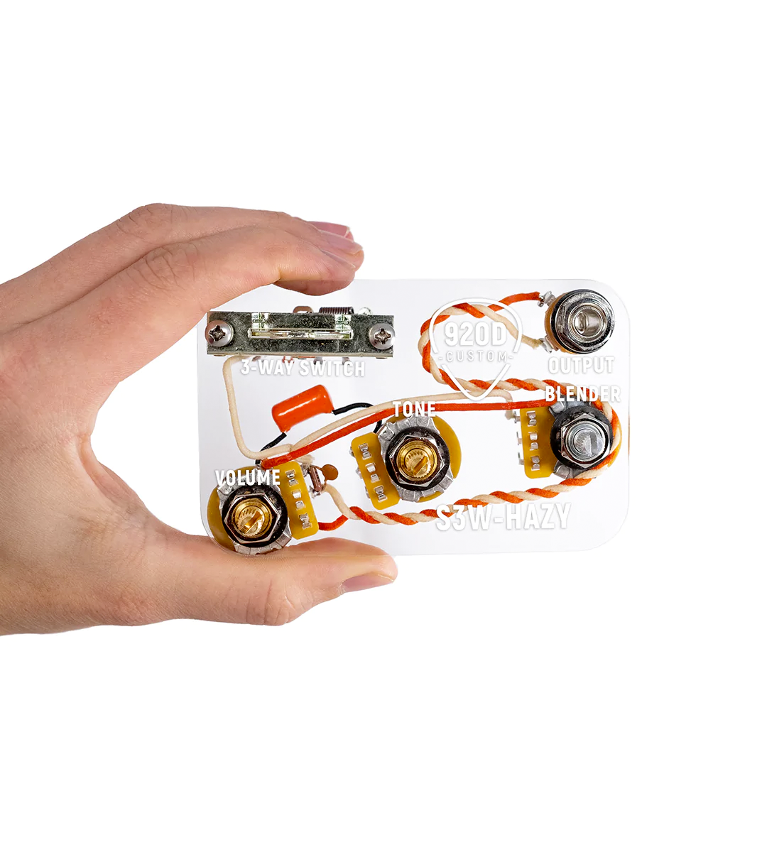 Our S3W-HAZY wiring harness is one of our all-time favorite setups. Instead of a traditional 5-Way switch, this Stratocaster harness utilizes a 3-Way switch that controls the bridge and neck pickups, much like a standard two pickup guitar.