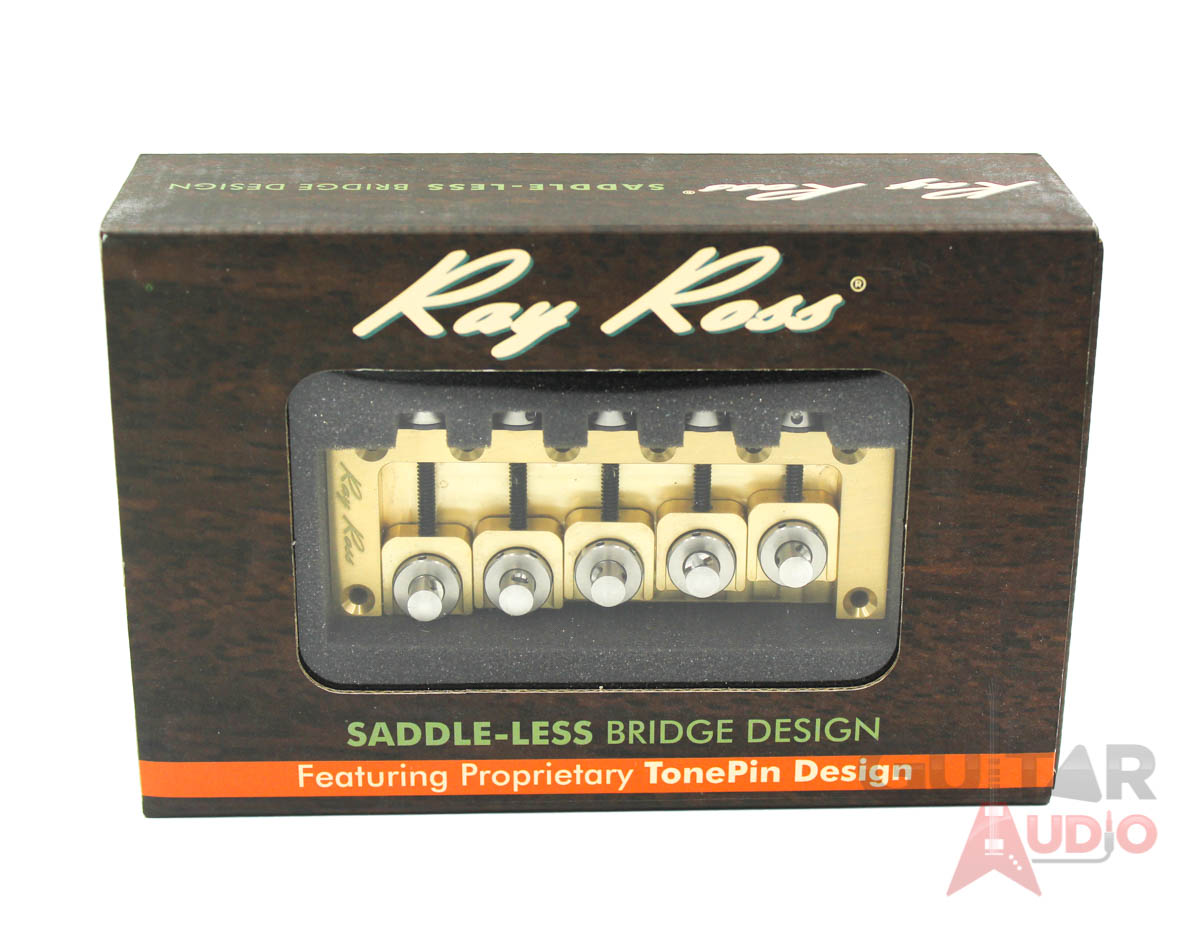 5-String! Introducing the new Ray Ross™ 5-String Bass Bridge, a retrofitting bridge that represents a revolutionary approach to the standard stringed instrument bridge design. Rather than utilizing a traditional saddle to provide a string break, the Ray Ross™ features a tone pin that keeps the string completely straight from the bridge to the nut; this concept removes the “kink” from the string, providing increased vibrational energy through the strings and into the body of the instrument. This feature allows maximum transference to the instrument so you can get the most of the bass itself, not solely the color of the bridge. Comprised of solid naval brass, the residual tone you do get from the bridge is articulate, resonant, and full-bodied.