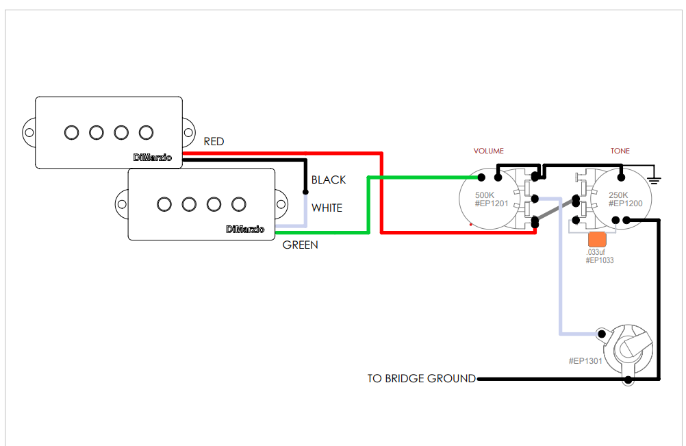 DiMarzio wiring harnesses are all hand assembled and tested in the USA using lead-free silver solder and the best sound-tested parts. We chose an Orange Drop .033 mf capacitor for a smooth high frequency roll off, and we use vintage-style 22-gauge push back cloth wire.