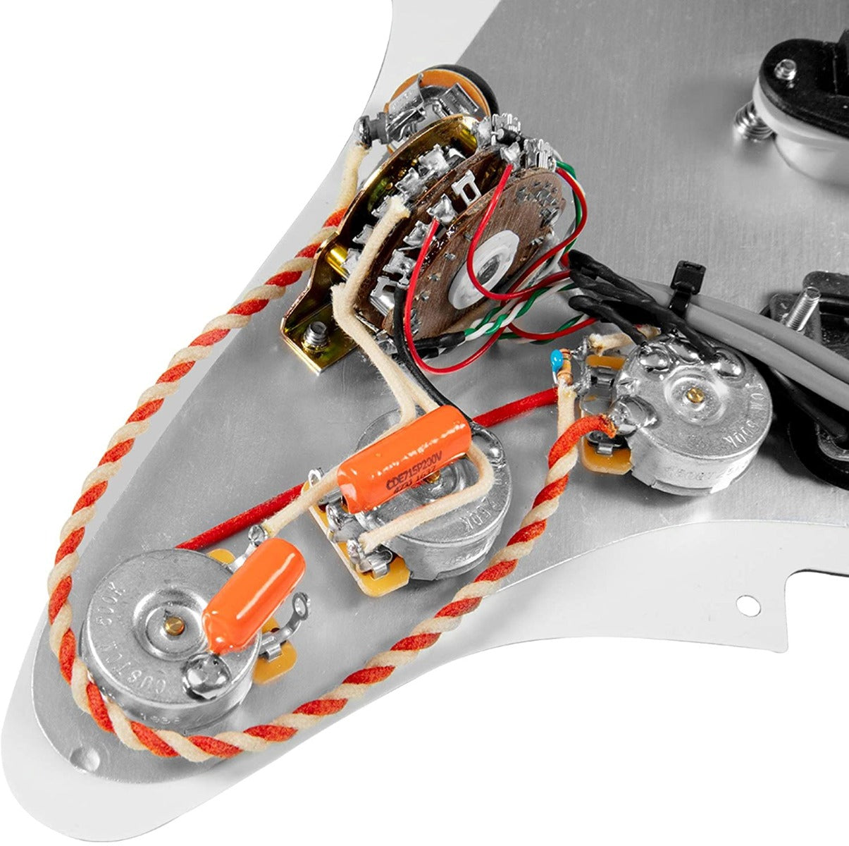 920D Custom Loaded pickguards feature point to point hand soldered connections with vintage style cloth wire, 920D Custom split shaft pots, CRL 5-way switches, custom cut pickguards, and top quality knobs and buttons. This pickguard features a Fiesta Pickups PAF Style AlNiCo 5 Smoothie in the bridge position and two Fiesta Hush Puppies Vintage AlNiCo 5 Hum-Cancelling pickups in the neck and middle positions. The bridge/middle selector position splits the dual coil humbucker. This is a classic sounding vintage output loaded pickguard.