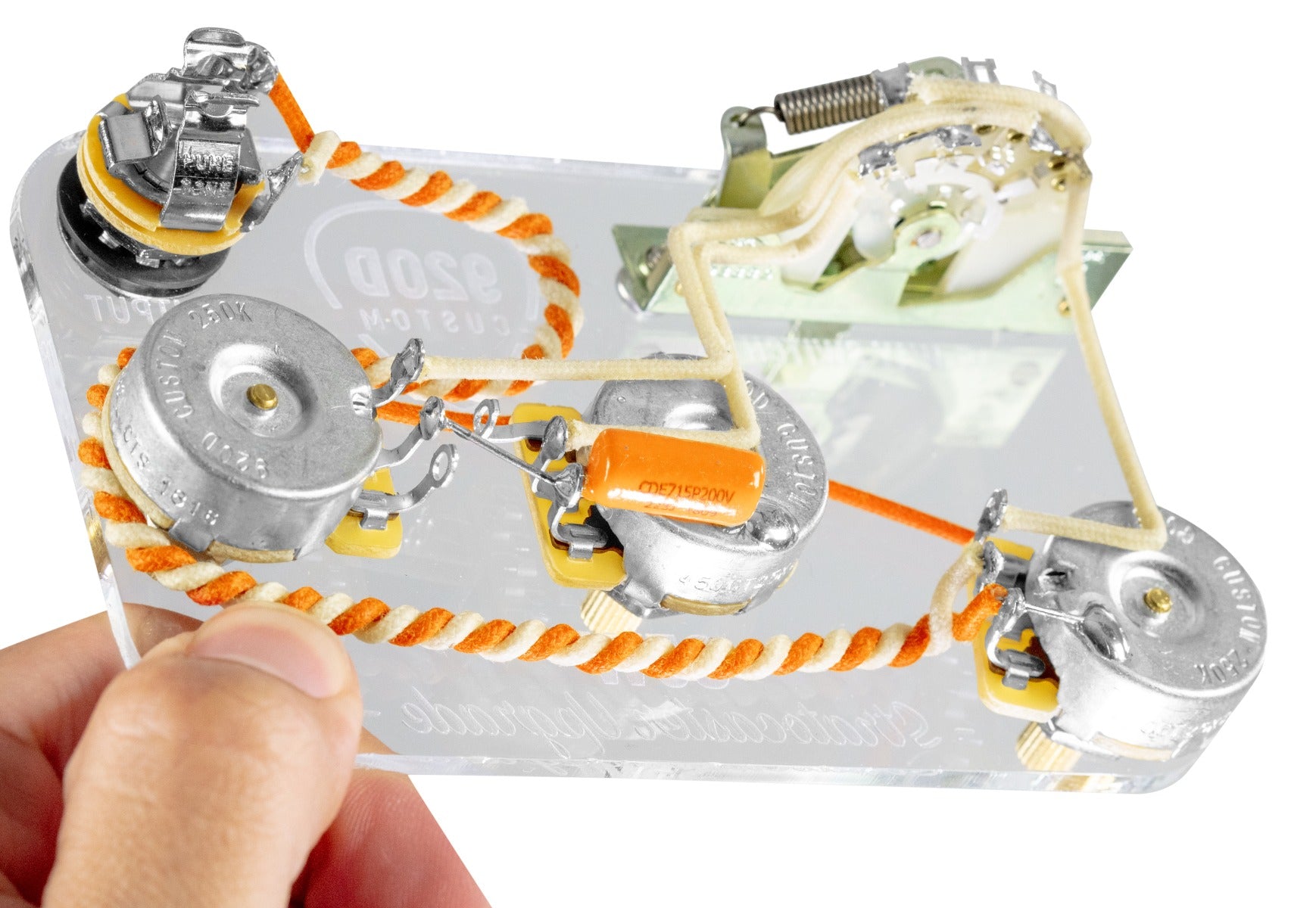 920D Custom Signature WiringAll 920D Custom products are highlighted with our signature orange wire. Gavitt Wire, a leading producer of premium guitar wire, has agreed to custom manufacture our signature cloth covered pushback wire, and we believe it is the perfect choice for hotrodding your guitar. The wire is built with an outer waxed cotton layer and an inner Celanese braid that provides impressive ruggedness while still maintaining a 22 gauge thickness. Limiting the amount of wire on each build compliments your choice of pickups by creating the perfect balance between capacitance and resistance. |