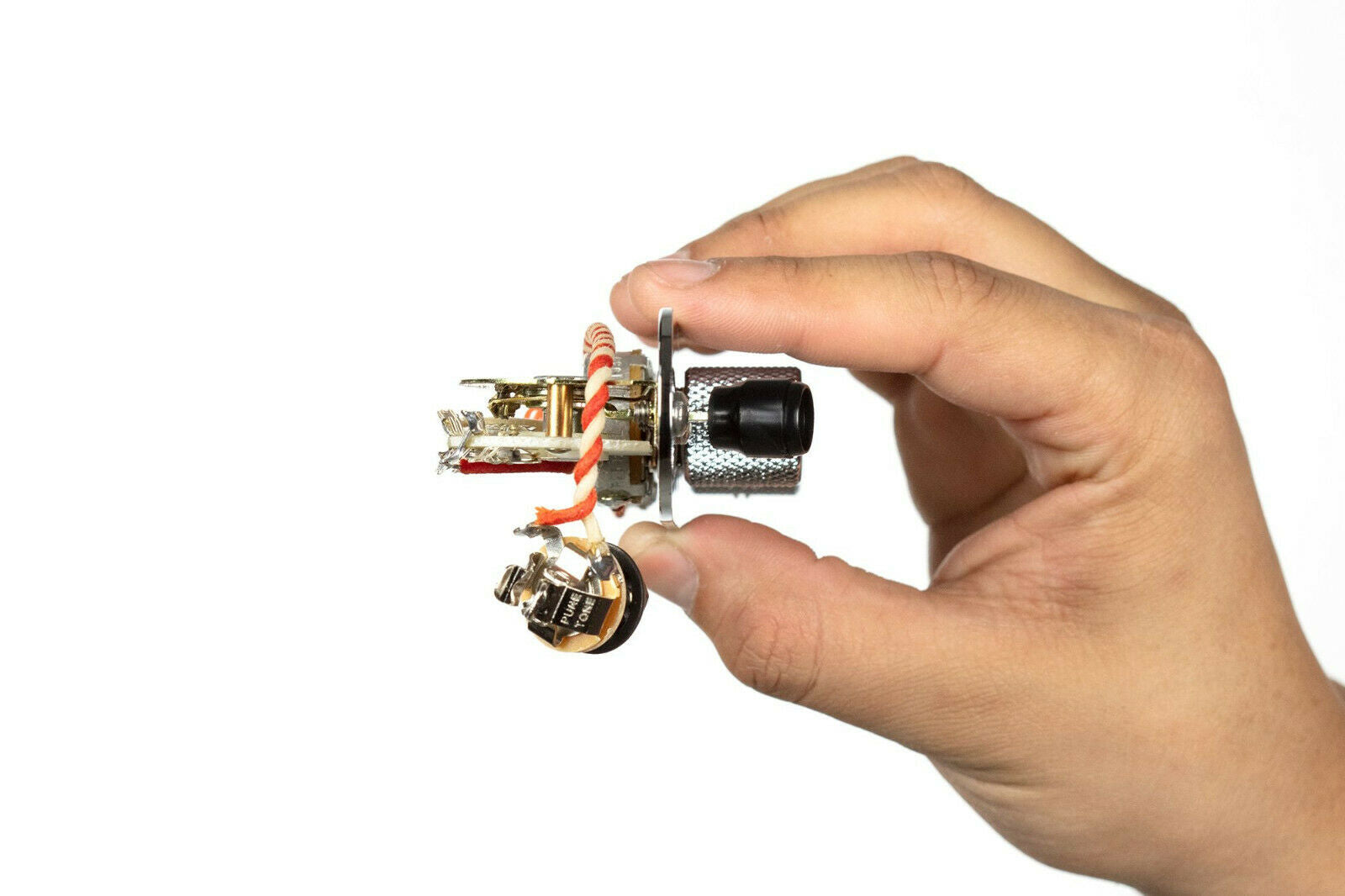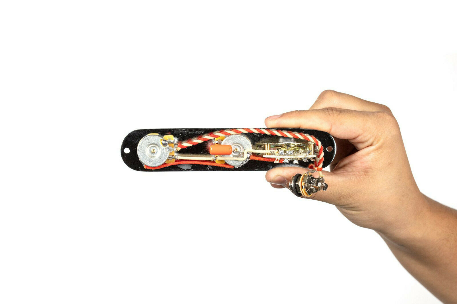 This model is our "volume knob forward" 4-way control plate for T style guitars. It orients the volume knob closer to your hand to facilitate easier reach of the volume knob for volume swells.