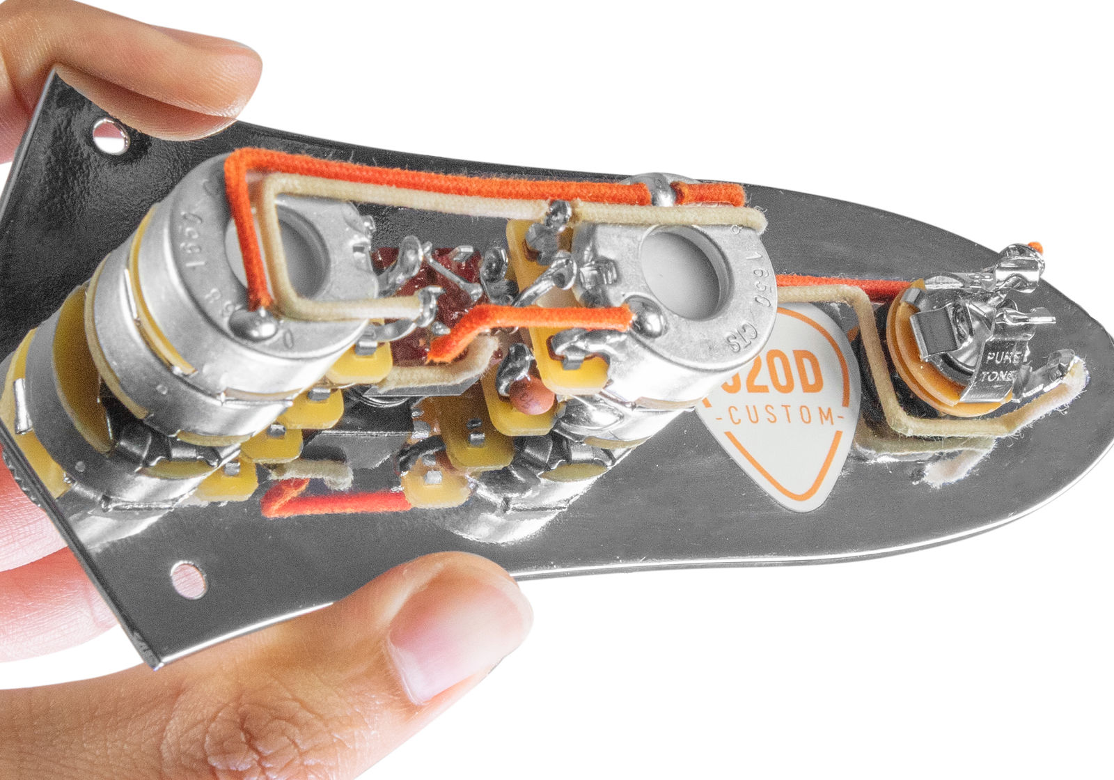 All 920D Custom products are highlighted with our signature orange wire. Gavitt Wire, a leading producer of premium guitar wire, has agreed to custom manufacture our signature cloth covered pushback wire, and we believe it is the perfect choice for hotrodding your guitar. The wire is built with an outer waxed cotton layer and an inner Celanese braid that provides impressive ruggedness while still maintaining a 22 gauge thickness. Limiting the amount of wire on each build compliments your choice of pickups by creating the perfect balance between capacitance and resistance.