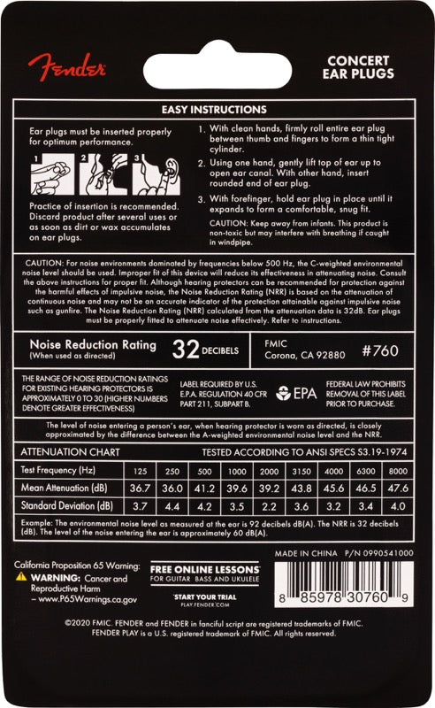 Fender Concert series ear plugs protect your hearing during concerts, festivals and other high-volume events. Featuring 10 pairs of Daphne Blue foam plugs, this pack is perfect for general concert and band practice use. Designed with a 32-decibel noise-reduction rating for maximum protection and noise attenuation, and super-soft disposable foam for a comfortable and customized fit.