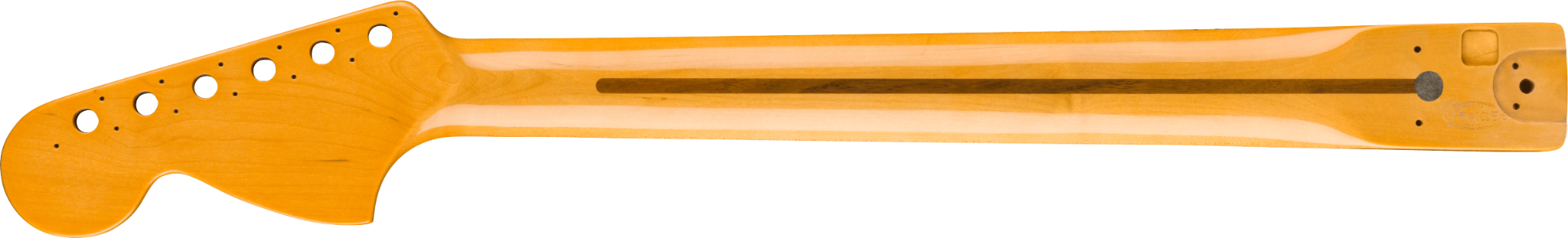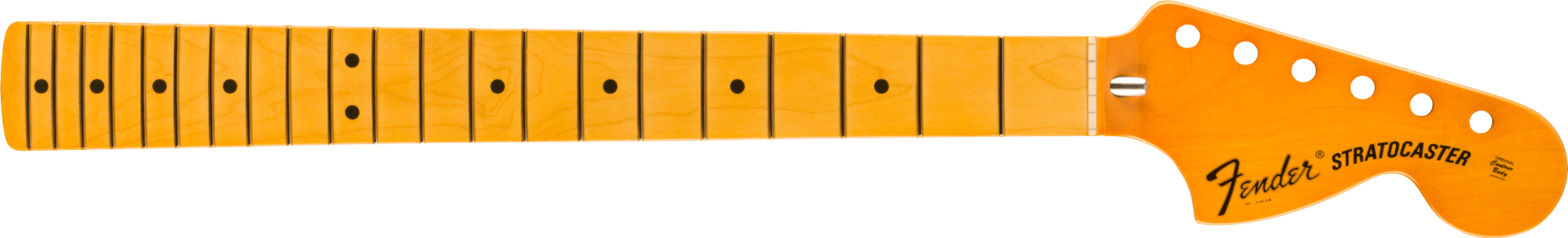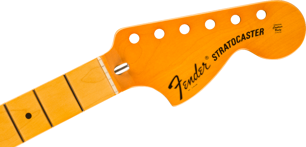 In vintage years, the shape and thickness of Fender guitar necks varied tremendously. The American Vintage II Series features authentic neck profiles from Fender's past. Crafted at our Corona, Calif. manufacturing facility, this genuine Fender American Vintage II 1973 Stratocaster guitar neck features a '73 "C"-shaped profile and 7.25"-radius round-laminated rosewood or maple fingerboard with 21 vintage-tall frets. The large '70's headstock and 3 bolt neck design with Micro-Tilt™ mechanism add the finishing touches to this vintage-style neck. The bone nut is pre-slotted with "pilot" string location grooves to make spacing a breeze when performing the final string slot filing and a gloss polyurethane finish offers a vintage feel. This replacement neck is the perfect way to give your Strat® an authentically '70s feel. This replacement neck is for a Fender or Squier® by Fender guitar. Because Fender genuine replacement necks have not been mounted to guitar bodies, nut slots must be cut by qualified personnel. Other installation processes may be required, such as fret work, fitting the neck to the neck pocket, and other instrument setup procedures. Your local FMIC Authorized Service Center can install genuine replacement necks; find Authorized Service Center locations near you in the "Support" section of fender.com.