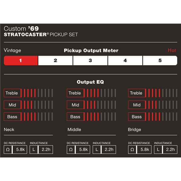 Fender Custom Shop '69 Stratocaster pickups produce one of the most revered guitar sounds in popular music history-the full, punchy late-'60s blues rock tone that ruled the era from Monterey on the West Coast to Woodstock on the East Coast. Because of the clarity and transparency created by the unique coil wind and magnet structure, the '69 pickup design works especially well with pedals allowing the low end to thump and the high end to soar.