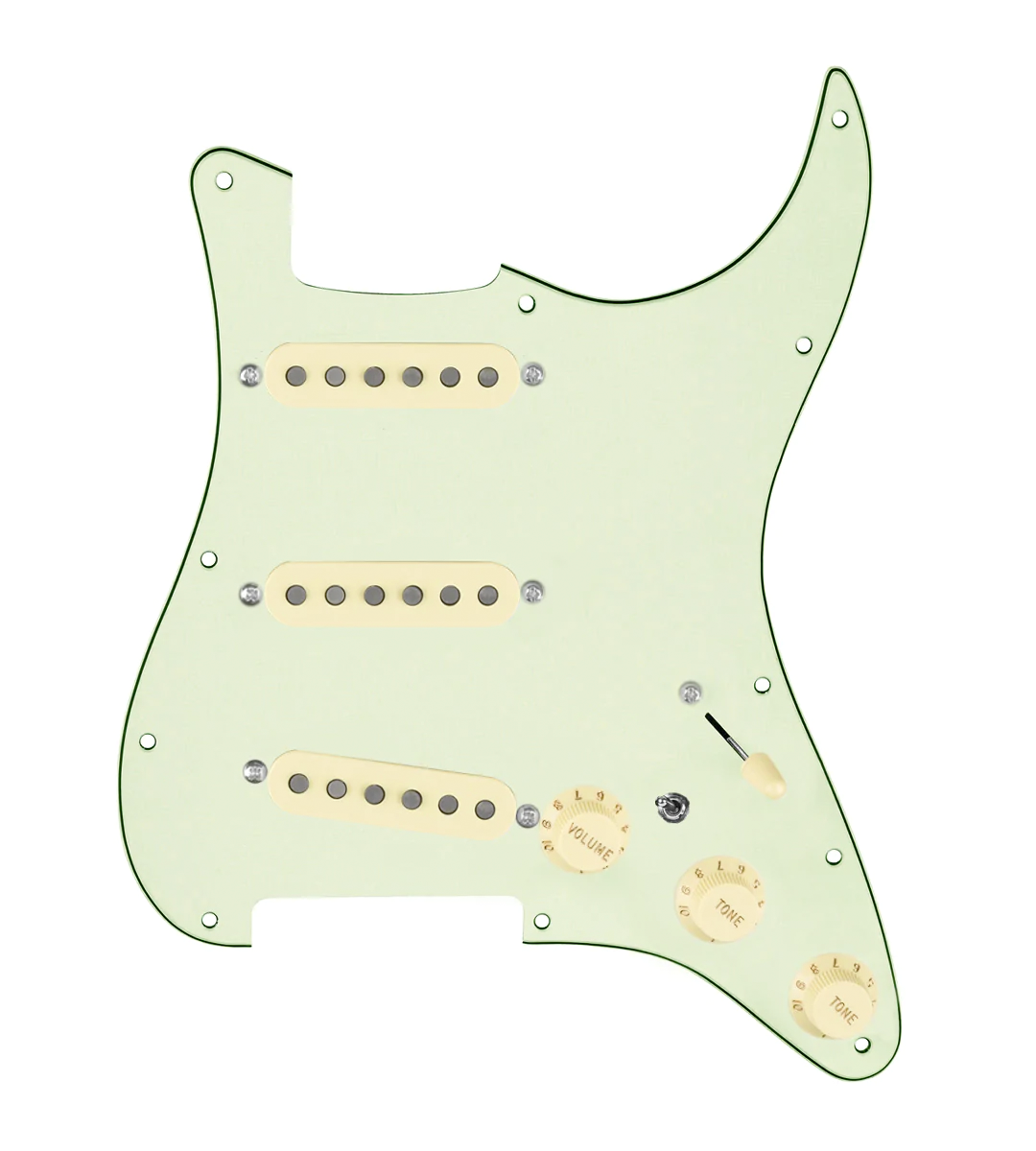 920D Custom Generation Loaded Pickguard For Strat With Aged White Pickups and Knobs, Mint Green Pickguard For Strat, and S7W-MT Wiring Harness