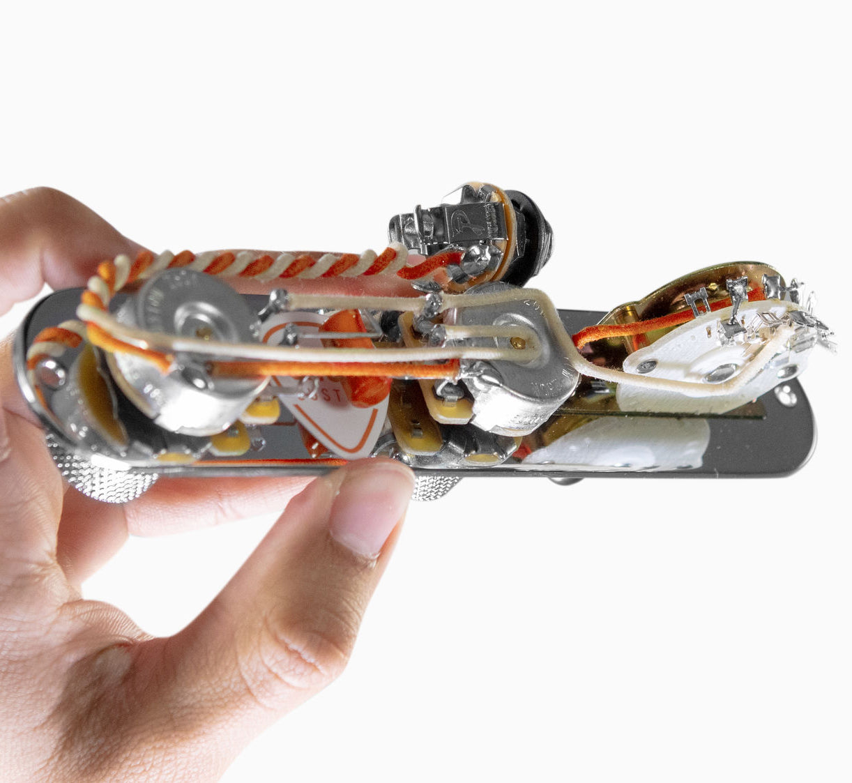 920D Custom Signature WiringAll 920D Custom products are highlighted with our signature orange wire. Gavitt Wire, a leading producer of premium guitar wire, has agreed to custom manufacture our signature cloth covered pushback wire, and we believe it is the perfect choice for hotrodding your guitar. The wire is built with an outer waxed cotton layer and an inner Celanese braid that provides impressive ruggedness while still maintaining a 22 gauge thickness. Limiting the amount of wire on each build compliments your choice of pickups by creating the perfect balance between capacitance and resistance. |