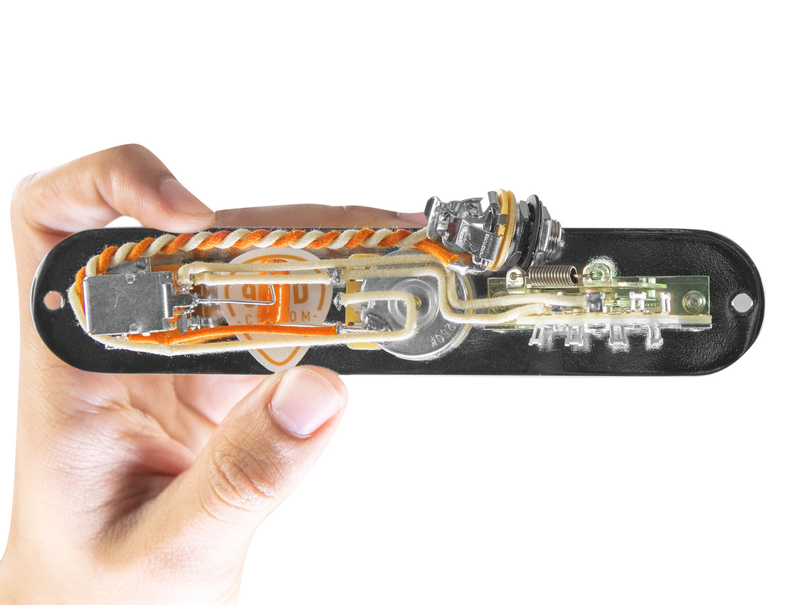 920D Custom Signature WiringAll 920D Custom products are highlighted with our signature orange wire. Gavitt Wire, a leading producer of premium guitar wire, has agreed to custom manufacture our signature cloth covered pushback wire, and we believe it is the perfect choice for hotrodding your guitar. The wire is built with an outer waxed cotton layer and an inner Celanese braid that provides impressive ruggedness while still maintaining a 22 gauge thickness. Limiting the amount of wire on each build compliments your choice of pickups by creating the perfect balance between capacitance and resistance. |
