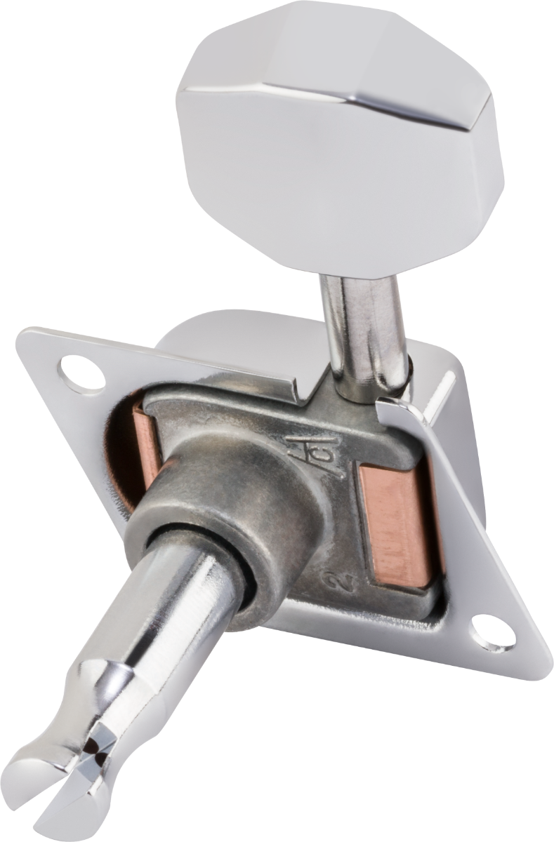 Fender '70s "F" Tuners. Chrome. Screws abd bushings included. Features offset mounting tabs, split tuning posts, and embossed "F" Logo. Set of 6 inline. Requires 3/8"(10mm) peghead holes.