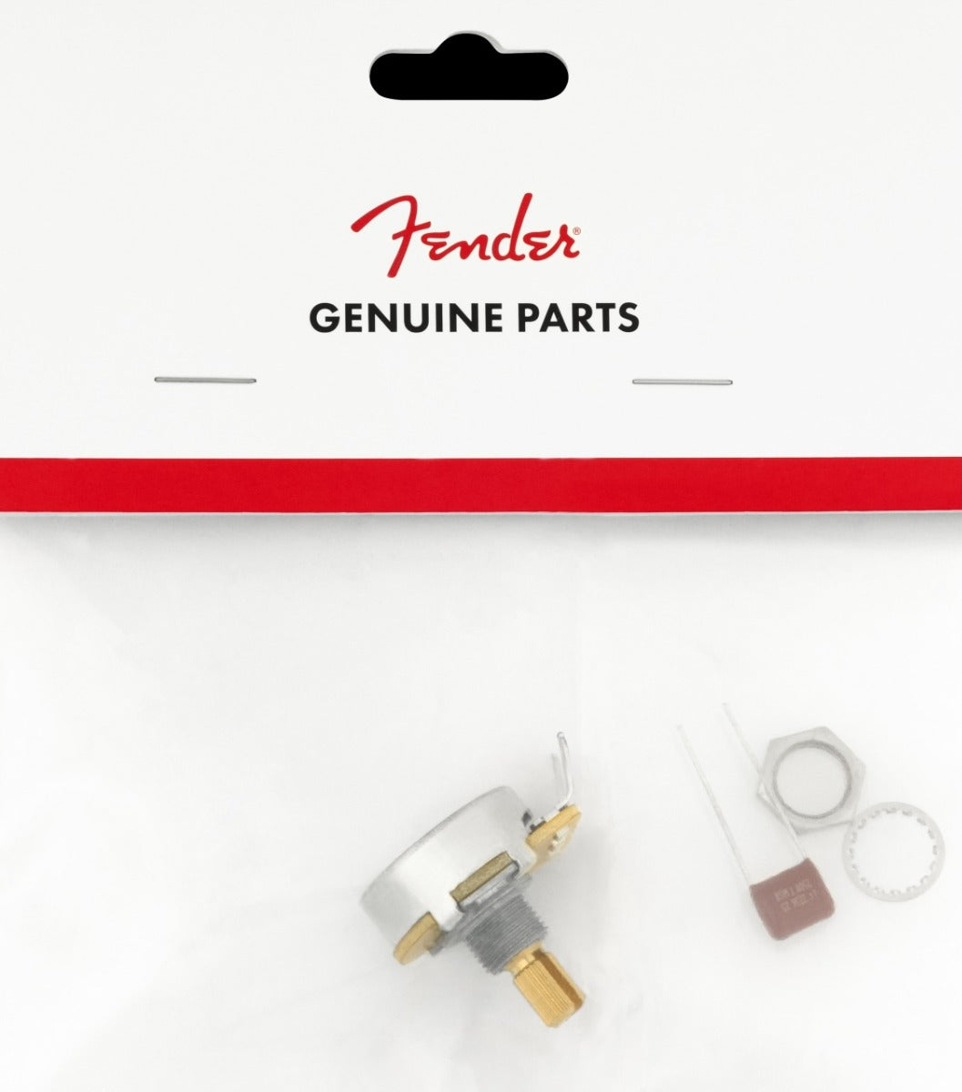 Vintage-accurate 250K 3/8" split shaft pot for volume or tone control. Accepts push-on-style control knobs Includes mounting nut, washer, and modern .022uf capacitor. Fits most vintage and modern Stratocaster guitars.