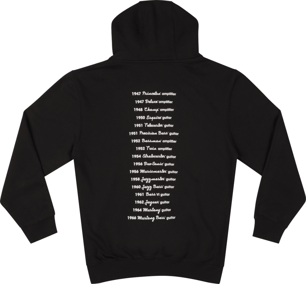 We honor our iconic past with a classic Fender transition logo and a tribute to milestone guitar and amp releases spanning from 1947 to 2019. This collection builds on our top-selling apparel, expanding the brand in bold, authentic ways. The hoodie flexes our iconic logo up front and legendary gear release dates from 1947 to 2019 on the back — a timeline of tone that changed music forever. Vintage feel, modern edge. Wear the legacy loud!