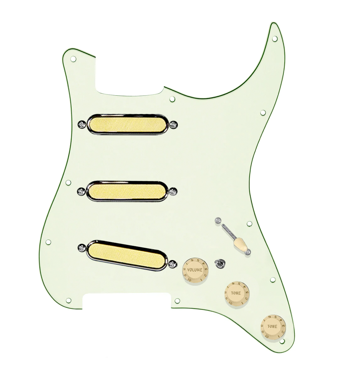 920D Custom Gold Foil Loaded Pickguard For Strat With Aged White Pickups and Knobs, Mint Green Pickguard For Strat, and S7W-MT Wiring Harness