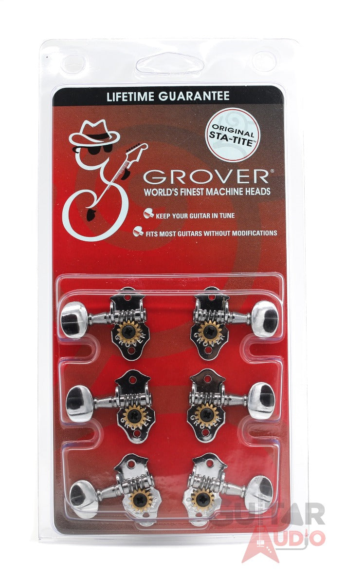 Grover Sta-Tite 3 a side '50s-'60s style chrome plated tuning machine set for older acoustic guitars. Complete with headstock bushings and mounting screws.