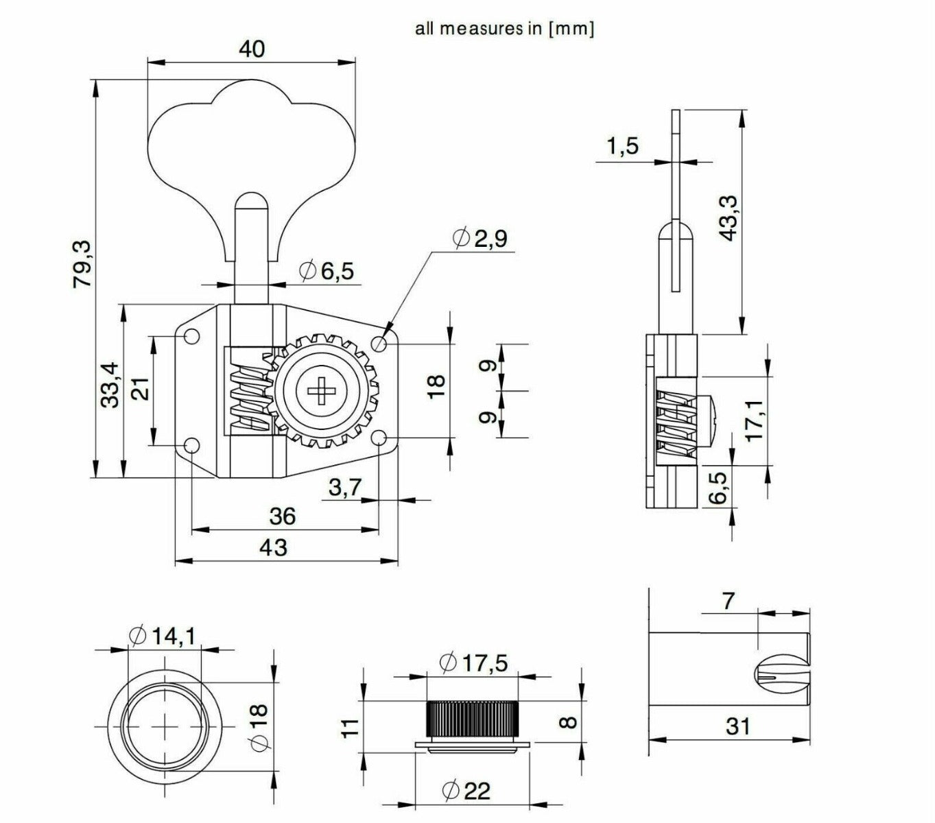 Get even more out of your G&L or MusicMan bass with the BT1! This unit will fin in an 11/16" headstock hole and has an option for regular or short tuning key. The short tuning key option fits US made G&L and MusicMan basses while the standard key retrofits the Schaller BML tuner. Installation instructions and mounting hardware included.