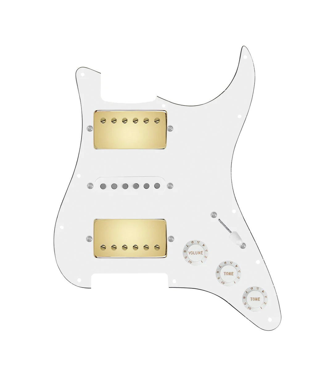 920D Custom HSH Loaded Pickguard for Stratocaster With Gold Smoothie Humbuckers, White Texas Vintage Pickups, White Pickguard, and S5W-HSH Wiring Harness