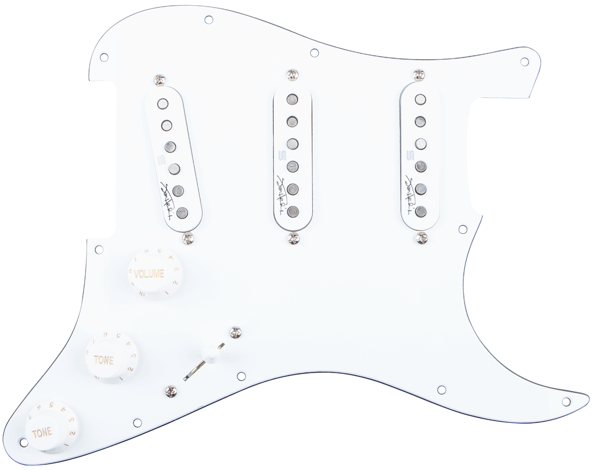 The Jimi Hendrix Signature Loaded Pickguard houses those pickups in a pre-loaded 3-ply white pickguard and is available with either a standard-angle bridge pickup route or a Voodoo route (reverse-angle bridge route).